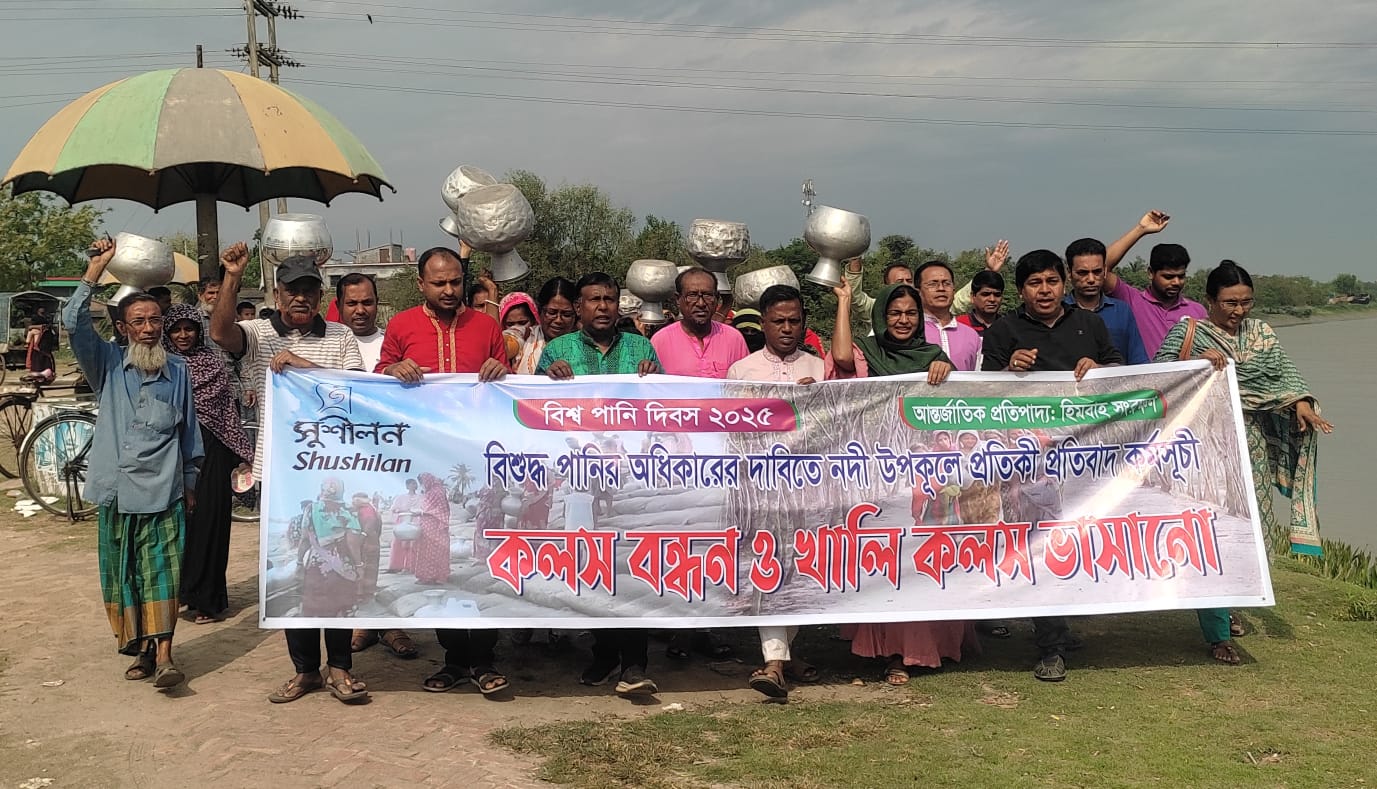 ২২ মার্চ শনিবার কালিগঞ্জের কাকশিয়ালী নদী উপকূলে শুরু হয় বিশ্ব পানি দিবসের আয়োজন। কিন্তু কোথায় শান্তি! সর্বত্র লবন পানি যা পান করা যায় না এমন-কি রান্না ও গোসলের কাজেও ব্যাবহার করা যায় না। তাই উপকূলের কলস ধর্মঘটের সমর্থনে শত শত নারী পুরুষ শিশু আজ শনিবার কাকশিয়ালী নদীতে ভাসিয়ে দিয়েছে খালি কলস।